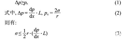 第三,HDAPS/SDS混合體系的動態(tài)界面張力達(dá)到超低界面張力的時間非常短,且能夠在極低的平衡界面張力下維持。由于在實際驅(qū)油過程中,驅(qū)油體系是在流動的狀態(tài)下與原油接觸,在短時間內(nèi)達(dá)到超低界面張力,對原油從巖石上啟動非常有利。而且,HDAPS/SDS混合體系與原油的界面張力在總濃度超過0.04%后就可以達(dá)到極低的10-5mN·m-1量級。對于存在于半徑為r的毛細(xì)管中長度為L的剩余油滴,當(dāng)油滴兩端的驅(qū)動壓差Δp大于等于毛細(xì)管壓力pc時,剩余油滴才能夠活化啟動,7即有:
