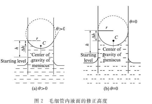 隨著內(nèi)半徑減小,凹液面趨于半球形狀,液面與管壁的接觸角趨于零(見圖2(b)),可得式(3):