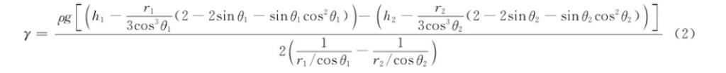 式中:ρ為試驗溫度下液體的密度;g為當?shù)刂亓铀俣?;h1、h2為自同一水平面起,差分組合的毛細管內(nèi)凹液面上緣的最大上升高度,因表面張力計算僅需同質(zhì)異徑毛細管內(nèi)液面的高度差,圖1中的起始平面可在管外瀝青液面與毛細管上升高度間指定;θ1、θ2為毛細管內(nèi)凹液面擬合為球冠狀之后的接觸角;r1、r2為差分組合的毛細管內(nèi)半徑大小。