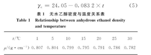 毛細管的實際內(nèi)半徑r與生產(chǎn)標號NRI有一定差異,需進行標定。文中毛細管內(nèi)半徑在0.08——0.50mm范圍內(nèi),難以直接測定。利用式(2),選擇無水乙醇作為標定液,內(nèi)半徑較粗、可測的毛細管作為基準管,反向標定較細毛細管的內(nèi)半徑。標定過程為:(1)通過電荷耦合器件(CCD)相機拍攝,并獲取基準管的內(nèi)半徑。(2)使用相機拍攝毛細管內(nèi)液面上升高度,以及無水乙醇與管內(nèi)壁的接觸角;(3)記錄試驗溫度t.根據(jù)無水乙醇的表面張力計算公式和溫度~密度特性表獲得其表面張力γe與密度ρ,見式(5)和表1.(4)將上述參數(shù)代入式(2),得到毛細管的內(nèi)半徑值。