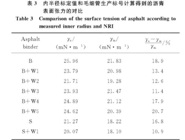 表3內半徑標定值和毛細管生產(chǎn)標號計算得到的瀝青表面張力的對比