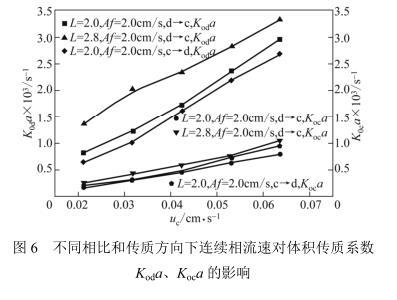 兩相流速、相比與傳質(zhì)方向?qū)w積傳質(zhì)系數(shù)的影響見(jiàn)圖6。圖中結(jié)果顯示:分別用有機(jī)相溶質(zhì)濃度和水相溶質(zhì)濃度表示傳質(zhì)推動(dòng)力得到的體積傳質(zhì)系數(shù)Koda和Koca隨著連續(xù)相流速的增加而增大,傳質(zhì)方向相同(d→c)時(shí),高相比的體積傳質(zhì)系數(shù)(Koda或Koca)大于低相比的體積傳質(zhì)系數(shù)。其原因主要還在于高流速和高相比的情況下,傳質(zhì)相界面積a更大。
