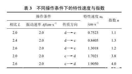 由表3中數(shù)據(jù)可以看出d→c的指數(shù)n在1.2左右,c→d的n在3.9左右,說(shuō)明指數(shù)只與體系的物性有關(guān),與操作條件無(wú)關(guān),傳質(zhì)方向不同導(dǎo)致指數(shù)n不同主要是有機(jī)相和水相分別作分散相的緣故。而特性速度與相比有關(guān)。由表3實(shí)驗(yàn)結(jié)果可以看出,正丁醇-丁二酸-水體系的特性速度同時(shí)受兩相流速、相比和傳質(zhì)方向的影響,它們都對(duì)液滴大小有影響。