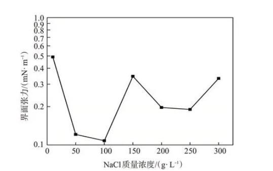 圖4含不同濃度NaCl的TPHS溶液與原油間的界面張力(TPHS質(zhì)量分?jǐn)?shù)0.3%)