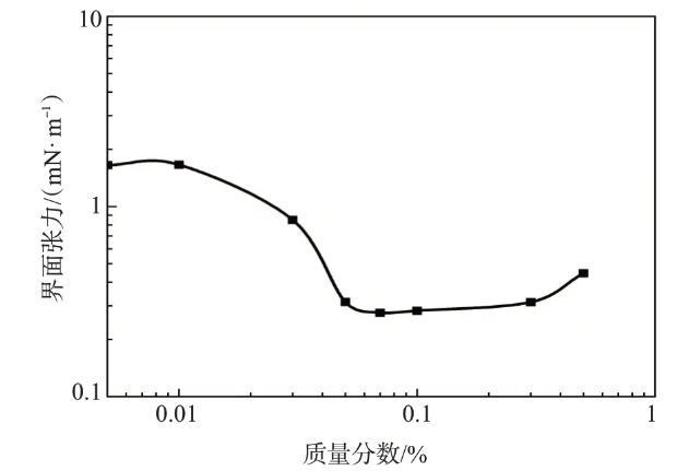 根據(jù)吉布斯吸附理論,為了達(dá)到超低油/水界面張力,表面活性劑分別與油相和水相發(fā)生強(qiáng)的相互作用并且在油水界面達(dá)到飽和吸附。這要求表面活性劑同時(shí)具有大的親水基和疏水基。不同濃度的表面活性劑TPHS溶液與大慶原油間的界面張力如圖3所示,隨著表面活性劑TPHS質(zhì)量分?jǐn)?shù)的增大,界面張力先減小后緩慢增大,在較大的濃度范圍內(nèi)可保持在10-1mN/m數(shù)量級(jí)。TPHS質(zhì)量分?jǐn)?shù)為0.07%時(shí),界面張力達(dá)到最低,為0.276 mN/m。TPHS具有較好的降低油水界面張力的能力。