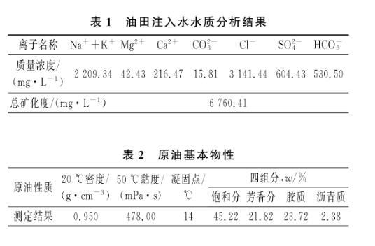 (1)主要材料。脂肪醇聚氧乙烯醚硫酸鈉、十二烷基苯磺酸鈉、十二烷基硫酸鈉,成都科龍化工試劑廠生產(chǎn);十六烷基二甲基甜菜堿、烷基糖苷APG1214,臨沂綠森化工有限公司生產(chǎn),上述藥品均為工業(yè)級(jí)。實(shí)驗(yàn)用水為油田注入水,水質(zhì)分析結(jié)果見表1;實(shí)驗(yàn)用油為X油田原油,其基本物性見表2。