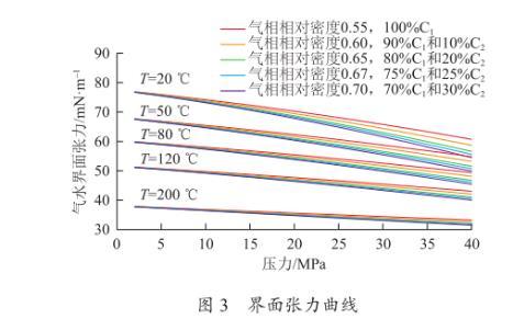 如圖3所示為利用新模型繪制的不同溫度和壓力下的界面張力曲線。從圖中可知,壓力越大,溫度越高,氣水界面張力越??;氣體相對(duì)密度越大,氣水界面張力越小。當(dāng)壓力和溫度分別為0~40 MPa和20~200℃時(shí),界面張力范圍為30~75 mN/m,不能看成常數(shù)。