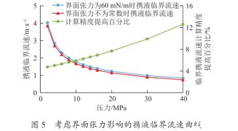 (1)界面張力對攜液臨界流量影響。如圖5所示為氣體相對密度為0.7,溫度為100℃時(shí),利用新模型計(jì)算當(dāng)界面張力為常數(shù)(60 mN/m)和界面張力隨壓力變化時(shí)不同壓力下的攜液臨界流速。考慮界面張力變化的攜液臨界流速要比界面張力為常數(shù)時(shí)的小,計(jì)算精度更高。且隨著壓力的增大,攜液臨界流速的計(jì)算精度提高百分比,逐漸從4%上升至12.5%,平均提高了8%。
