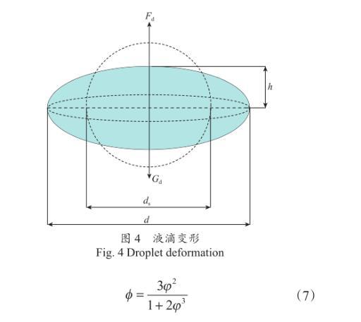 如圖4所示,ds為球形液滴的直徑,m;d為液滴變形后迎風(fēng)面直徑,m;h為橢球體短軸高度,m。液滴等效直徑比φ為球形液滴直徑與變形后迎風(fēng)面直徑比,即φ=ds/d。當(dāng)液滴為橢球形時(shí),其表面積近似為
