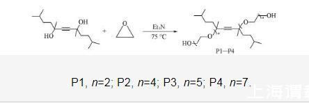 4種表面活性劑的合成條件相同,以P1的合成為例。首先將450 g(1.77 mol)2,5,8,11-四甲基~6-十二炔~5,8-二醇加入到高壓反應(yīng)釜中,用高純氮氣置換釜內(nèi)氣體3次;隨后加入3.65 g(0.036 mol)三乙胺,升溫至75℃后勻速通入316 g(7.18 mol)環(huán)氧乙烷,并持續(xù)反應(yīng)3.5 h;反應(yīng)完成后,將反應(yīng)釜冷卻至室溫,打開反應(yīng)釜閥門將殘余的環(huán)氧乙烷排放至尾氣吸收裝置,收集粗產(chǎn)物;通過旋轉(zhuǎn)蒸發(fā)儀除去粗產(chǎn)物中的三乙胺,得到739 g淡黃色液體,產(chǎn)率為96.5%.P2,P3和P4的合成步驟與表征見本文支持信息圖S1——S4.