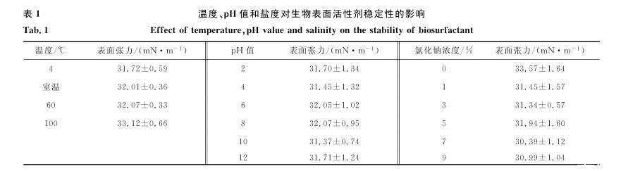 表1溫度、pH值和鹽度對(duì)生物表面活性劑穩(wěn)定性的影響
