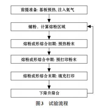 的當(dāng)量直徑,μm;ni為當(dāng)量直徑為di的顆粒的個數(shù)。計算可知,試驗(yàn)粉末的算術(shù)平均直徑為65μm。再取100 mL的試驗(yàn)粉料稱重,凈重為0.40 kg;計算得到試驗(yàn)粉末體積孔隙率ε為0.49,因此粉末顆粒并非最緊密堆積狀態(tài)。熔粉制備了橫截面積為5 cm2,長5 cm的圓棒,每層鋪粉0.10 mm,實(shí)驗(yàn)流程如圖3所示。