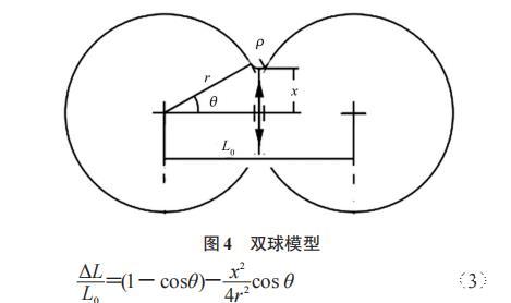電子束熔粉與激光熔粉不同,因?yàn)殡娮邮且詭щ娏W拥亩ㄏ蜻\(yùn)動產(chǎn)生的動能作為能量來源的,所以必須有導(dǎo)電回路才能不斷地轟擊工件。但粉末層是孔隙材料,導(dǎo)電性較差,因此在電子束接觸粉末的瞬間可能出現(xiàn)靜電潰散現(xiàn)象。為了確定熔粉初期的工藝模式,文章選用了雙球模型,計算不發(fā)生靜電潰散時的臨界線收縮量,結(jié)構(gòu)模型如圖4所示。計算公式如式(3)。
