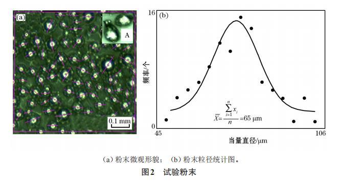 本文以不銹鋼316L(022Cr17Ni12Mo2)球粉為成形原料,顆粒直徑為45~106μm(如圖2所示)【316L不銹鋼的微觀組織:相鄰熔覆道之間的搭接良好。組織主要由胞狀晶和呈外延生長的柱狀晶組成,柱狀晶的取向各不相同。由于熔池邊界處粉末未熔化區(qū)域溫度較低,因此一部分晶粒沿著熔池邊界外延生長,同時在SLM過程中,熔池內(nèi)部經(jīng)歷快速冷卻,表面張力形成梯度,熔池內(nèi)部存在“馬戈紊流”,熔池內(nèi)發(fā)生對流,導(dǎo)致熔池內(nèi)部散熱方向發(fā)生改變,因此,造成晶粒顯示出不同的生長方向。胞狀晶呈正六邊形,為柱狀晶的截面,柱狀晶晶粒十分細(xì)小,直徑分布在0.4~0.7μm?!?,根據(jù)筆者已有的研究結(jié)果選擇合適的工藝,詮釋顆粒群的熔合線收縮和再結(jié)晶過程。由于試驗(yàn)粉末顆粒直徑分布廣,為了建立粉末計算模型,用式(1)、(2)計算了顆粒群的當(dāng)量直徑d和算術(shù)平均直徑d。