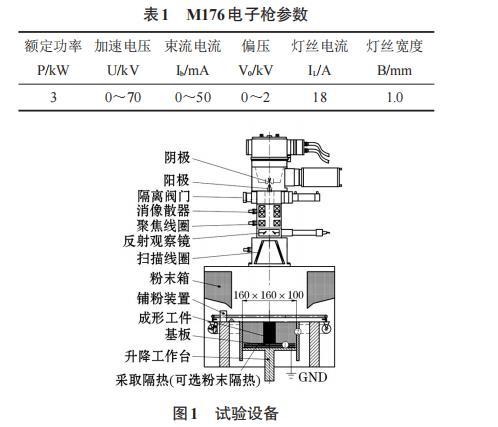 試驗(yàn)設(shè)備為桂林獅達(dá)公司自制的THDW-3型電子束熔粉打印機(jī),電子槍的型號為M176,電子槍真空度為5×10-2Pa,熔粉成形室注入氦氣之后的真空度為0.3 Pa。電子槍的參數(shù)如表1所示。成形設(shè)備如圖1所示。