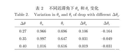 接觸線開始釘扎和去釘扎時(shí)液滴分別達(dá)到前進(jìn)接觸角和后退接觸角,隨著遲滯角的增加,前進(jìn)接觸角增大,后退接觸角減小,且后退接觸角減小的幅度大于前進(jìn)接觸角增大的幅度.通過改變接觸角遲滯有利于調(diào)控液滴運(yùn)動(dòng),從而控制蒸發(fā).