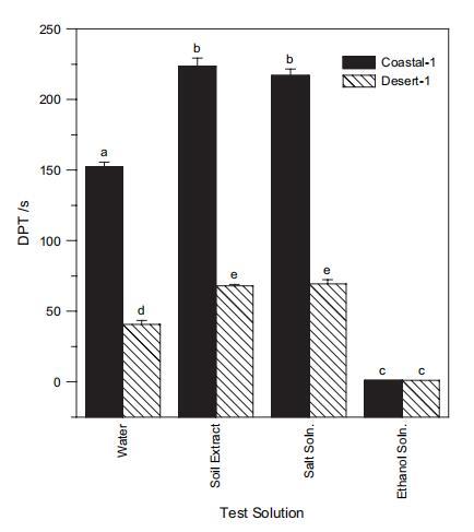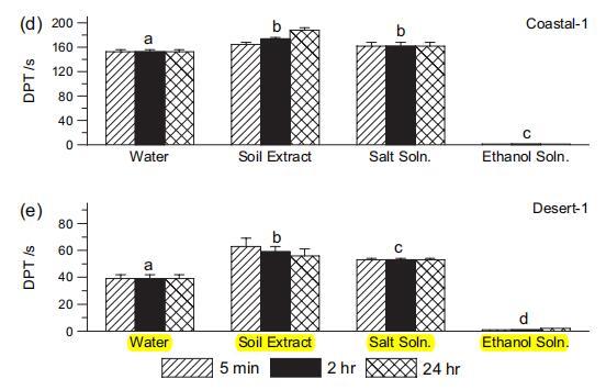 圖 4 水滴滲透時(shí)間 (DPT),2:1 w : w 2 小時(shí) 用于 Desert-1 和 沿海 1 土壤。 誤差棒顯示重復(fù)的標(biāo)準(zhǔn)偏差 滴。 小寫字母給出了兩側(cè) t 檢驗(yàn)的結(jié)果。 不同字母表示均值在 P ? 0.01 顯著性水平。