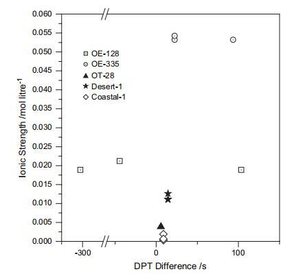 圖5 液滴穿透時(shí)間(DPT)的差異 鹽溶液和水,與鹽的離子強(qiáng)度 解決方案。