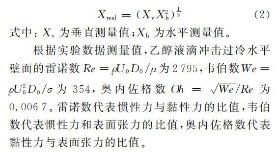 根據(jù)實(shí)驗(yàn)數(shù)據(jù)測(cè)量值,乙醇液滴沖擊過冷水平壁面的雷諾數(shù)Re=ρU0D0/μ為2795,韋伯?dāng)?shù)We=ρU20D0/σ為354,奧內(nèi)佐格數(shù)Oh=We/Re為0.0067。雷諾數(shù)代表慣性力與黏性力的比值,韋伯?dāng)?shù)代表慣性力和表面張力的比值,奧內(nèi)佐格數(shù)代表黏性力與表面張力的比值。