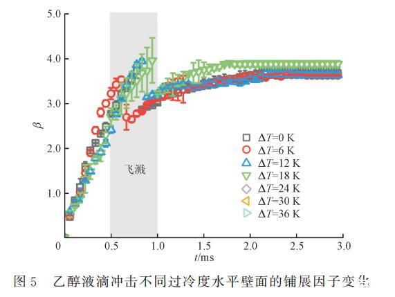為了探究水平壁面過冷度對(duì)液滴沖擊的影響機(jī)制,定義無量綱鋪展因子β=D(t)/D0,其中D(t)為液滴每一時(shí)刻的直徑,Dmax為液滴能達(dá)到的最大鋪展直徑,對(duì)應(yīng)的最大鋪展因子為βmax=Dmax/D0。圖5展示了不同水平壁面過冷度下,乙醇液滴沖擊水平壁面的鋪展因子β隨時(shí)間的變化曲線??梢钥闯?,乙醇液滴沖擊不同過冷度水平壁面均在1.0ms內(nèi)發(fā)生破碎-飛濺,在這段時(shí)間內(nèi),鋪展速率近似為線性,在飛濺后,β突然減小,隨后鋪展因子繼續(xù)增,鋪展速率逐漸減小,最終趨于0,液滴形態(tài)不再發(fā)生變化。