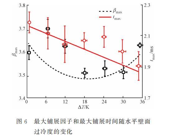 根據(jù)液滴鋪展隨時(shí)間的變化,提取了不同過冷度下的βmax和tmax并繪制了圖6。如圖所示:隨著水平壁面過冷度的增大,βmax呈現(xiàn)了先減小后增大的非單調(diào)變化趨勢(shì),并在水平壁面過冷度為18.0~30.0K時(shí)達(dá)到最小值;不同于βmax的變化趨勢(shì),tmax呈現(xiàn)逐漸減小的趨勢(shì),這是由于隨著水平壁面過冷度的增加,換熱加劇,液滴的溫度降低,這使得密度、黏度、表面張力增加,抑制了最大鋪展時(shí)間。根據(jù)Shang等提出的換熱模型,將乙醇液滴看作一個(gè)整體,并將液滴沖擊過冷水平壁面的過程看作圓柱形不斷“變矮”和“變寬”的過程,可以得到乙醇液滴沖擊過冷水平壁面的溫度降低范圍為1.8~3.7K。
