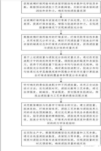獲取玻璃纖維網(wǎng)格布的表面形貌結(jié)構(gòu)參數(shù)和化學性質(zhì)參數(shù),根據(jù)預(yù)設(shè)的浸膠工藝參數(shù)閾值,判斷纖維表面的浸潤性和親和力,確定初始浸膠量范圍;在玻璃纖維網(wǎng)格布表面進行等離子體處理,引入親水性基團,提高纖維表面能,增強與膠液的親和力,在低浸膠量的情況下實現(xiàn)高浸膠充分性;根據(jù)玻璃纖維網(wǎng)格布的纖維直徑、纖維間距等結(jié)構(gòu)參數(shù),采用有限元分析方法,模擬不同浸膠量下膠液在纖維表面的鋪展狀態(tài)和纖維束內(nèi)部的滲透深度,獲得浸膠量與浸膠充分性的定量關(guān)系;基于上述浸膠量與浸膠充分性的定量關(guān)系,通過改變膠液配方中的助劑種類和用量,調(diào)控膠液的黏度和表面張力,獲得不同浸膠量下膠液分布均勻性的變化規(guī)律,結(jié)合浸膠充分性的要求,確定最佳膠液配方,膠液分布均勻性通過光學顯微鏡觀察和圖像分析軟件定量計算膠液在纖維表面的覆蓋率和厚度分布來描述;針對確定的最佳膠液配方和不同浸膠量,采用正交試驗設(shè)計方法,優(yōu)化浸膠時間、浸膠次數(shù)等工藝參數(shù),通過拉伸強度、耐堿性、彎曲強度、剪切強度性能測試,篩選出浸膠量與工藝參數(shù)的最佳匹配方案;采用數(shù)值模擬與機器學習相結(jié)合的方法,建立浸膠量、膠液性能、纖維表面性質(zhì)、浸膠工藝參數(shù)與浸膠效果之間的非線性預(yù)測模型,通過優(yōu)化算法尋找各參數(shù)的最優(yōu)組合,指導(dǎo)浸膠量的精確控制,浸膠效果包括浸膠充分性、膠液分布均勻性、纖維束內(nèi)部滲透深度和最終復(fù)合材料的力學性能指標;在實際生產(chǎn)中,根據(jù)預(yù)測模型設(shè)定浸膠量和工藝參數(shù),通過在線監(jiān)測膠液黏度、表面張力等參數(shù),并結(jié)合機器視覺對浸膠后網(wǎng)格布表面形貌的檢測,實現(xiàn)浸膠量的實時反饋控制,確保浸膠質(zhì)量的穩(wěn)定性。