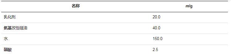 氨基改性硅油在未經(jīng)乳化處理之前,通常為一種油狀或半固態(tài)的物質(zhì),不易與水相混合。而氨基改性硅油柔軟劑需要在水中分散均勻,才能被紡織物充分吸收和利用,發(fā)揮柔軟、抗靜電等作用。因此,上述步驟下制得的氨基改性硅油還需要進(jìn)一步的乳化處理,才能形成氨基改性硅油柔軟劑,否則不能發(fā)揮柔軟劑的作用,反而還會(huì)損傷紡織物。室溫下,將乳化劑、氨基改性硅油、醋酸與水按照一定的比例混合,然后200 r/min攪拌5 min,即可制成氨基改性硅油柔軟劑。乳化方案中各物質(zhì)比例見表1。