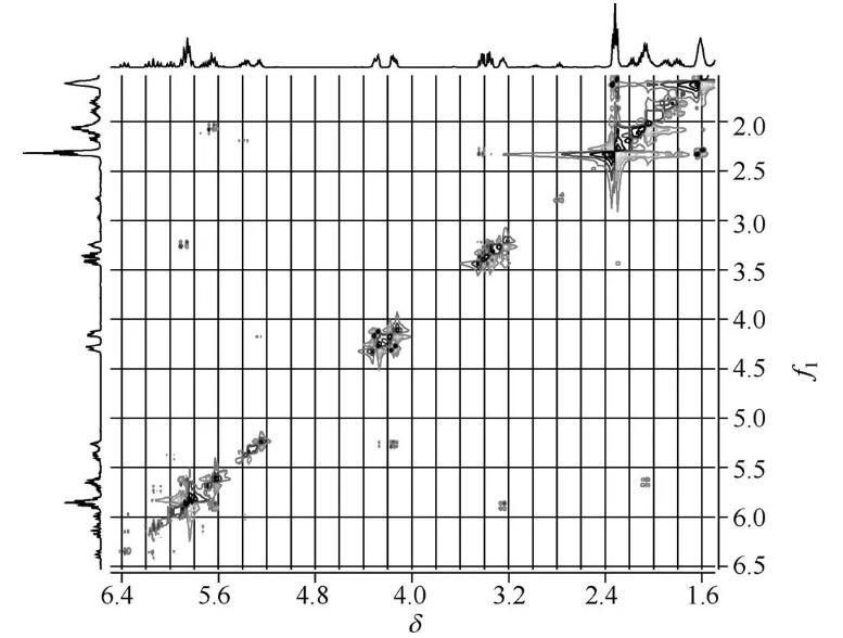桐油及桐油酸酐的1H NMR見圖2,從圖中可以看出,隨著加成反應(yīng)的進(jìn)行,桐油中的烯鍵上的氫信號(8~13),TM2烯鍵上的氫信號(11~17)及TM3烯鍵上的氫信號(11~13)明顯減弱,峰型也發(fā)生很大變化。依據(jù)圖2(b)中的各峰積分面積比例確定桐油與兩個馬來酸酐反應(yīng)形成TM2,進(jìn)一步與馬來酸酐反應(yīng),共軛三烯的氫信號[圖2(b)中14~17]完全消失。由于桐油結(jié)構(gòu)較復(fù)雜,1H NMR歸屬較困難,TM 2經(jīng)1H-1H COSY譜(圖3)分析,從圖3中可以看出,信號3和6相關(guān),為甘油酯緊連的兩個亞甲基氫;6′和8相關(guān),為新生成的六元環(huán)相鄰的兩個氫;5和5′分別與12和12′相關(guān),7和13、13′相關(guān),9和10相關(guān),11和14相關(guān),14和17相關(guān),12、17與15、16相關(guān)。結(jié)合圖2(b)、圖2(c)中信號7、8、9的積分比例分別為1∶2∶2及3∶6∶4,及TM2的1H-1H COSY譜分析,TM2及TM3結(jié)構(gòu)各質(zhì)子信號歸屬如圖2所示。