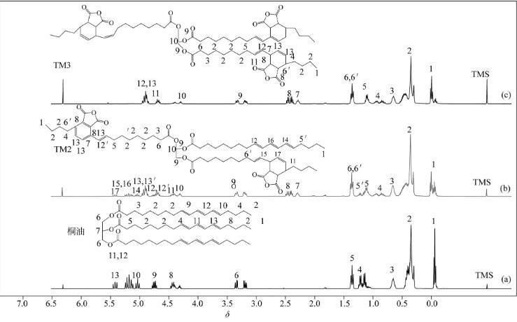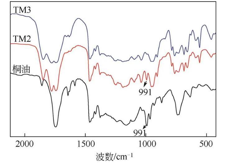 桐油中的共軛不飽和鍵與馬來酸酐易發(fā)生Diels-Alder(D-A)反應(yīng),生成桐油酸酐,反應(yīng)條件對產(chǎn)物的分布具有重要影響。由于桐油為混合物,每分子中有3條不飽和鏈,控制MA的加入量及反應(yīng)條件,可以控制桐油二酸酐(TM2)和桐油三酸酐(TM3)的形成。文獻(xiàn)報道大多數(shù)桐油和馬來酸酐反應(yīng)以有機(jī)錫為催化劑,經(jīng)過研究發(fā)現(xiàn),溫度對馬來酸酐與桐油反應(yīng)影響較大,溫度低反應(yīng)很慢,有機(jī)錫催化劑并不能明顯降低反應(yīng)溫度。在無催化劑的條件下,以紅外光譜跟蹤80℃、100℃、120℃及140℃下桐油與3倍量的馬來酸酐反應(yīng)的情況,結(jié)果表明80℃下反應(yīng)緩慢,100℃反應(yīng)1h后桐油的共軛三鍵的紅外吸收峰幾乎完全消失,反應(yīng)程度能達(dá)到96%。桐油及桐油酸酐的FTIR如圖1所示,991cm–1為桐油共軛三鍵的面外彎曲振動紅外吸收峰,兩倍量馬來酸酐與桐油反應(yīng)的產(chǎn)物(TM2)中991cm–1的吸收峰明顯減弱但未消失,3倍量馬來酸酐與桐油反應(yīng)的產(chǎn)物中該峰完全消失,說明桐油分子上的共軛三鍵可以同馬來酸酐反應(yīng)形成三酸酐TM3。