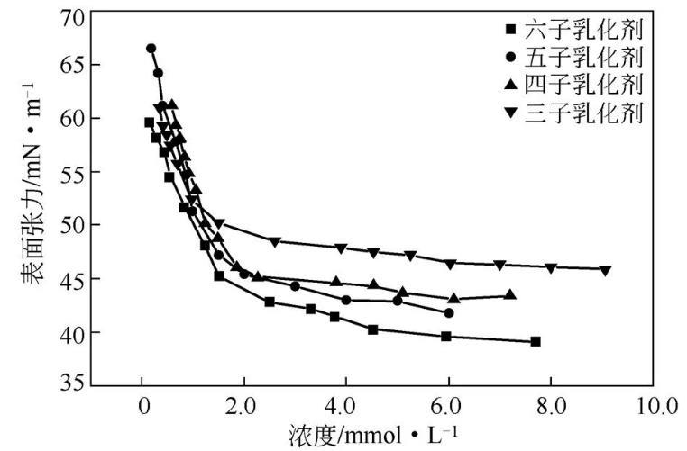 將桐油三酸酐和桐油三酸酐與甲基丙烯酸β羥乙酯反應(yīng)后的產(chǎn)物TM3H1及TM3H2水解,形成羧基官能團(tuán)數(shù)為4~6的丙烯酸酯改性的桐油基衍生物,TM3H3含有3個羧基。將羧酸改性的桐油用堿等當(dāng)量中和,形成含3~6個羧酸鈉基團(tuán)的桐油基衍生物,簡稱為3~6子乳化劑。桐油及乳化劑的表面張力測試結(jié)果如圖5所示,與純水(實測表面張力69mN/m)相比,4種多子乳化劑均能降低水的表面張力。表面張力隨其濃度的增加而下降,當(dāng)乳化劑濃度大于2.5mmol時,溶液的表面張力隨濃度的變化趨于平穩(wěn),逐漸接近水平。乳化劑濃度為1.5mmol/L時,3~6子乳化劑表面張力分別為50.2mN/m、48.8mN/m、47.2mN/m和45.2mN/m。