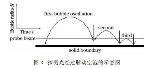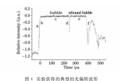 圖3給出了探測光經過脈動空泡的示意圖,圖中空泡脈動特性曲線是基于空泡半徑隨時間變化的數(shù)值模擬得到的。圖4即為由探測裝置圖2(a)獲得的對應的典型光偏轉信號波形圖,它包含了激光作用于水中靶材時的三種物理現(xiàn)象和過程,即激光等離子體沖擊波、等離子體空泡及其反彈現(xiàn)象、空泡潰滅沖擊波。圖中峰a為激光等離子體沖擊波;c為等離子體空泡信號;e為空泡反彈信號;f為空泡收縮到最小泡體積時輻射的沖擊波信號;b為空泡膨脹壁;d為空泡收縮壁。