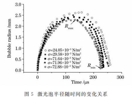 從圖5可以看出,表面張力減緩了空泡的膨脹過程。在初期,空泡膨脹變緩的現(xiàn)象不甚明顯,愈到后期越明顯。液體張力越大,空泡對應的最大泡半徑越??;表面張力加速了空泡的收縮。表面張力越大,空泡收縮所能達到的最小泡半徑越小,且表面張力縮短了空泡脈動周期。從圖5還可以看出表面張力對空泡潰滅的影響要強于對膨脹的影響。此外,激光泡半徑隨表面張力變化與液體的表面張力數(shù)值并不為線性關系,其關系有待研究。