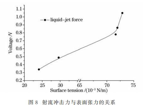圖8為射流沖擊力隨液體表面張力的變化關系,從圖可以看出,隨著液體表面張力的增大射流沖擊力也增大;且液體張力越大,靶材受到的射流沖擊強度越大,這是因為液體表面張力加速了空泡的收縮,縮短了空泡潰滅歷時,增加了空泡潰滅速度,所以空泡潰滅時表面張力所起的加速作用也愈大,其所產生的瞬時沖擊力也愈大。因射流沖擊力是造成靶材破壞的主要原因,所以張力較大的液體中空泡能產生較大的空蝕效應。