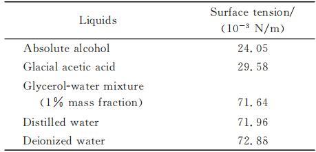 由于本文研究液體張力變化對固壁面近旁空泡生長和潰滅過程的影響,因此所用液體的粘滯系數(shù)μ及密度ρ應大體相近,在空氣中的表面張力應有較大差異。實驗采用5種液體,其表面張力如表1所示。