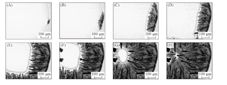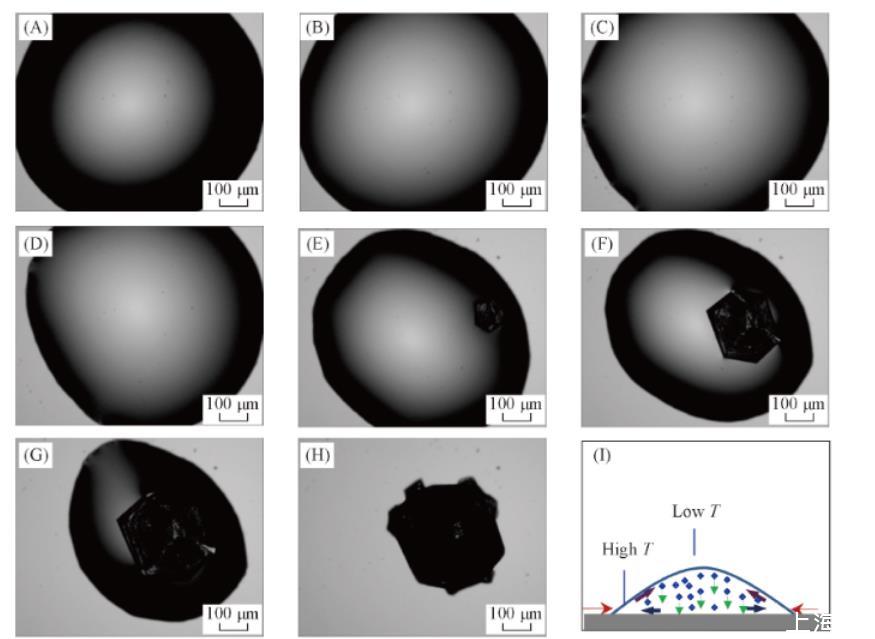 實驗發(fā)現(xiàn),純水液滴和NaCl水溶液液滴在玻璃基底上蒸發(fā)時其三相接觸線均發(fā)生不同程度的收縮。圖1所示為NaCl溶液液滴的蒸發(fā)過程。可以看出,接觸線的收縮并非連續(xù)不斷,而是在一定時間內(nèi)先保持“釘扎”[圖1(A),(B)].在此過程中,接觸角不斷減小,從而使得表面張力的水平分力增大,當其超越基底對接觸線產(chǎn)生釘扎作用時,就會引起接觸線的收縮。由于基底結(jié)構(gòu)的不均勻性,液滴各方向的收縮也可能是不均勻的,如圖1(C)——(H)所示。由于蒸發(fā)過程中接觸線不能釘扎,蒸發(fā)造成的Marangoni對流以及重力沉降作用使得NaCl在液滴中心區(qū)域富集,如圖1(I)所示。因而NaCl晶體首先在液滴中心區(qū)域析出。