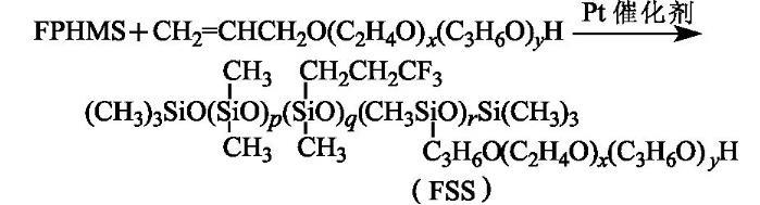 按n(Si-H)∶n(C=C)=1∶1比例將FPHMS和F6以及溶劑異丙醇加入裝有攪拌器、回流冷凝管和溫度計的四口燒瓶中,通N2,攪拌15 min,然后升溫至70——90℃,再滴加氯鉑酸醇溶液(以鉑計,占總單體質(zhì)量分數(shù)的4.0×10-5),并保溫反應4——6 h后,于90℃、60 kPa真空脫低沸物30 min,冷卻,得淺褐色至褐色透明液體,即氟硅表面活性劑(FSS),其黏度為850 mPa·s,并溶于冷、熱水。反應式為:
