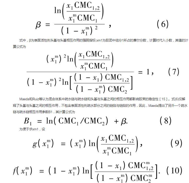 式中,β為表面活性劑頭基與頭基相互作用的強弱指標(biāo);xm1為膠團(tuán)中組分1所占的摩爾分?jǐn)?shù),計算時代入小數(shù),其值的計算公式為