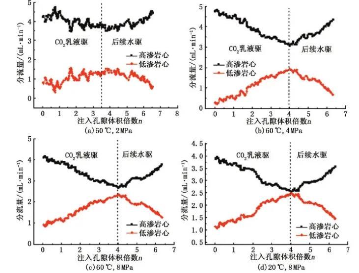 相比于高滲巖心,低滲巖心中由于毛管力較大,使得CO2乳液液滴與液膜之間的壓差大,導(dǎo)致CO2乳液易發(fā)生破裂而形成氣竄,減弱了CO2乳液的封堵性能,從而降低了流動阻力,同時(shí)乳液更傾向于進(jìn)入高滲巖心,在巖心滲流過程中疊加的賈敏效應(yīng)會使高滲巖心的滲流阻力不斷增加,直至大于低滲巖心的滲流阻力,依據(jù)這一機(jī)制CO2乳液能夠?qū)崿F(xiàn)分流作用。