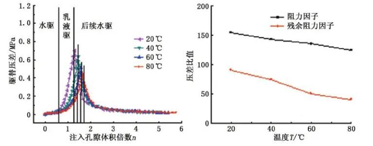 從圖9可以看出,隨著壓力的升高,阻力因子和殘余阻力因子均逐漸增強(qiáng),說明形成的乳液性質(zhì)大幅提高,之后隨壓力的升高增幅變小。這是由于隨著壓力的升高,CO2乳液界面黏彈性增加,乳液穩(wěn)定性增強(qiáng),乳液的強(qiáng)度及抗沖刷能力提高,且CO2密度也隨著壓力的升高而增大,因此乳液的表觀黏度增加較為明顯,從而提高了乳液的封堵能力。