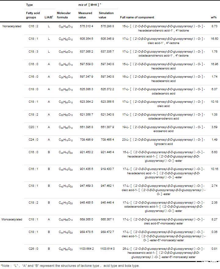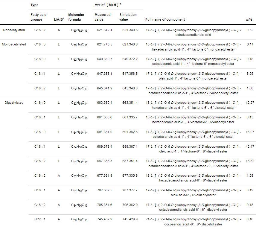 表2去乙酰化SLs同系物組分和質(zhì)量分?jǐn)?shù)(Continued from previous page)