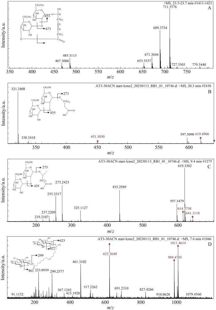 圖2(A)乙?;疭Ls保留時(shí)間為23.6 min組分的質(zhì)譜圖.(B)去乙?;疭Ls保留時(shí)間為20.3 min組分的質(zhì)譜圖.(C)去乙酰化SLs保留時(shí)間為9.4 min組分的質(zhì)譜圖.(D)去乙?;疭Ls保留時(shí)間為7.6 min組分的質(zhì)譜圖