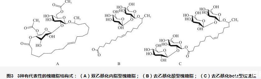圖3 3種有代表性的槐糖脂結(jié)構(gòu)式:(A)雙乙?;瘍?nèi)脂型槐糖脂;(B)去乙?;嵝突碧侵?;(C)去乙?;痓ola型槐糖脂