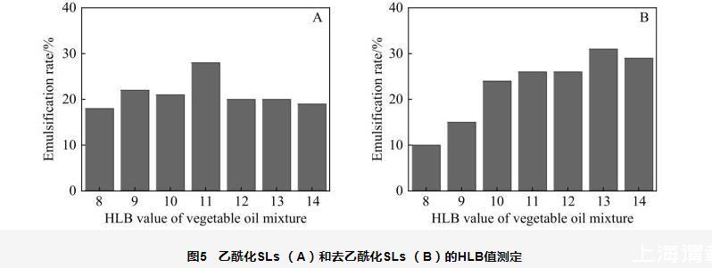 圖5乙?;疭Ls(A)和去乙酰化SLs(B)的HLB值測定