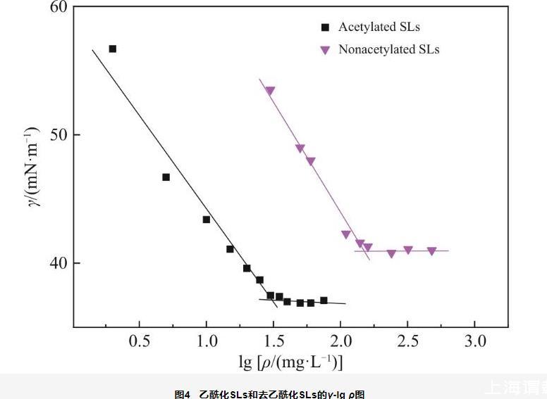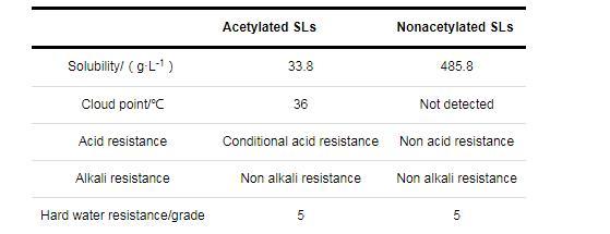 乙?;疭Ls和去乙?;疭Ls的溶解性、濁點(diǎn)和耐酸堿性如表3所示,可以看出,去乙酰化SLs在水中的溶解度達(dá)到485.8 g/L,較乙酰化SLs提高了14倍以上。這是由于去乙酰化SLs中含有豐富的親水羥基,能夠與水分子形成穩(wěn)定的氫鍵。乙?;疭Ls濁點(diǎn)為36℃,可能限制其在高溫環(huán)境中的應(yīng)用;去乙酰化SLs則無明顯濁點(diǎn),這是由于其組分中自由酸性和bola型SLs占絕對優(yōu)勢,這2類糖脂組分的分子轉(zhuǎn)動(dòng)自由度高,使其不易結(jié)晶。另外,乙?;碧侵瑸橛袟l件的耐酸級,但是為非耐堿級;去乙酰化SLs則為非耐酸堿級,這可能是由于SLs的分子含有的β-糖苷鍵或羧酸基團(tuán)容易在酸堿條件下發(fā)生水解。2類SLs均具有良好的抗硬水性能,達(dá)到最高級5級。