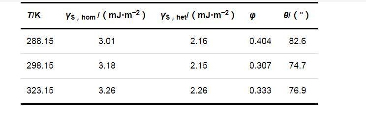 兩種成核機制時的固-液界面張力(γS,hom和γS,het)、形狀因子(φ)和接觸角(θ)的計算結果列于表2.可以看出,在同一溫度下,均相成核時的固-液界面張力大于非均相成核時的固-液界面張力;溫度對固-液界面張力的影響并不明顯,固-液界面張力只隨溫度的升高略有增加.