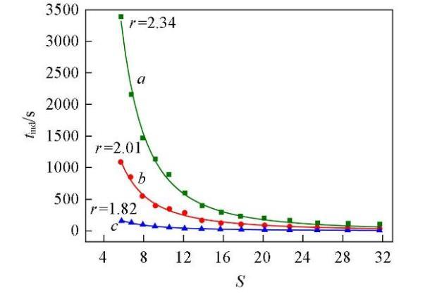 分別在288.15,298.15和323.15 K時研究了NaCl的添加對Li2CO3成核誘導期的影響,每組實驗均在Cl?的超額含量(Y=0.5)的條件下進行,結果見圖4.可知,在同一溫度下,Li2CO3的成核誘導期仍然隨過飽和度的增大而縮短;在同一過飽和度下,Li2CO3的成核誘導期隨溫度的升高而縮短,而且在添加NaCl(Y=0.5)后,溫度對Li2CO3成核誘導期的影響比未添加(Y=0)時更為顯著.如,在過飽和度S=5.76,溫度從288.15 K升高到323.15 K時,添加NaCl后Li2CO3的成核誘導期縮短了73.01%,而未添加NaCl時Li2CO3的成核誘導期縮短了67.89%.