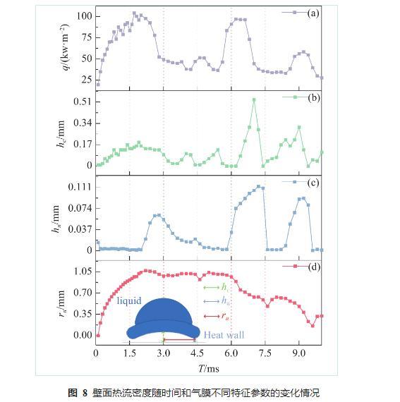 從圖7可以看出,相對(duì)于壓強(qiáng)的變化情況,壁面的熱流密度與氣膜的相關(guān)性更強(qiáng),氣膜厚度的變化會(huì)引起熱流密度的變化。圖8是液滴撞擊過程中壁面平均熱流密度及氣膜不同特征參數(shù)隨時(shí)間的變化情況,圖8(a)是壁面平均熱流密度,可以看出,平均熱流密度的變化情況受液滴中心氣膜厚度影響較大,在前期鋪展階段中心氣膜厚度出現(xiàn)明顯波動(dòng)時(shí)熱流密度也相應(yīng)波動(dòng),在液滴收縮階段,熱流密度變化明顯與頸部氣膜厚度成正相關(guān);圖8(b)是液滴中心氣膜高度,中心氣膜高度波動(dòng)最為劇烈,在液滴撞擊前3 ms內(nèi),即液滴鋪展階段先伴隨不穩(wěn)定波動(dòng)升高再保持穩(wěn)定,當(dāng)液滴開始收縮時(shí)出現(xiàn)大范圍的波動(dòng);圖8(c)是液滴頸部氣膜厚度,頸部與中心點(diǎn)通常為液滴底部氣膜厚度最薄點(diǎn),也是熱流密度峰值點(diǎn);圖8(d)是液滴的頸部半徑長(zhǎng)度,它的變化規(guī)律與液滴鋪展情況相似,且可以用來表示液滴與壁面的有效換熱面積。相較其他兩項(xiàng)特征參數(shù)而言,液滴中心氣膜厚度顯然對(duì)熱力學(xué)能具有更高的影響。