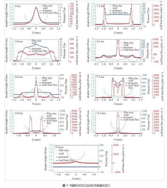 圖7展示了不同球面位置處氣膜厚度、壁面壓力及熱流密度,從圖中可以看出壁面熱流密度及壓力與氣膜厚度的對(duì)應(yīng)關(guān)系。當(dāng)t=0.0 ms時(shí),液滴即將撞擊球面,此時(shí)中心點(diǎn)氣膜厚度最薄,對(duì)應(yīng)的壁面位置壓力與熱流密度都高于其它位置;t=1.5 ms時(shí),液滴向四周鋪展,在距液滴中心大約1 mm處氣膜厚度達(dá)到最低,可以看出熱流密度與壓力都在此處發(fā)生驟增,在距離液滴中心更近的位置又因氣膜厚度增大而驟減,顯然壓力與熱流密度都與氣膜厚度成反比;t=3.0 ms時(shí),液滴繼續(xù)鋪展,邊緣處氣膜厚度升高,熱流密度與壓力都在降低,而邊緣至中心位置氣膜厚度降低,熱流密度略有升高,但氣膜厚度波動(dòng)較大,因此熱流密度與壓力也出現(xiàn)了不同程度的波動(dòng);t=4.5 ms時(shí),液滴鋪展達(dá)到最大,中心位置與邊緣處氣膜厚度都在減小,中心位置氣膜厚度更小,此處熱流密度與壓力增幅更大;t=6.0 ms時(shí),液滴開始彈跳,中心及邊緣處所受壓力增加;t=7.5 ms時(shí),中心位置氣膜厚度較低且波動(dòng)較大,因此中心位置壓力及熱流密度都發(fā)生了振蕩,變化幅度較大;t=9.0 ms-15.0 ms時(shí)段,液滴逐漸脫離熱壁面,氣膜厚度發(fā)生變化,壓力與熱流也隨之變化,直到液滴脫離壁面。