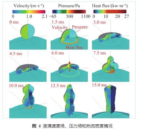 圖4液滴速度場(chǎng)、壓力場(chǎng)和熱流密度情況