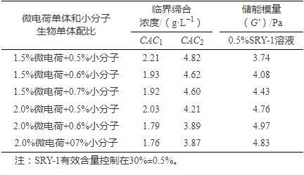 室內(nèi)合成實驗研究發(fā)現(xiàn),微電荷單體對降低CAC2貢獻較大,用量優(yōu)選為1.5%~2.5%,而小分子生物單體對降低CAC1貢獻較大,用量優(yōu)選為0.5%~0.7%,兩種單體共同作用下臨界締合濃度降低和黏彈性提高顯著,最優(yōu)結果見表3。可見當采用2.0%微電荷單體+0.6%小分子生物單體組合時,溶液具有較強的黏彈性,此時SRY-1的CAC1,CAC2分別為1.79 g·L?1、3.89 g·L?1,對應SRY-1用量接近0.18%、0.4%。